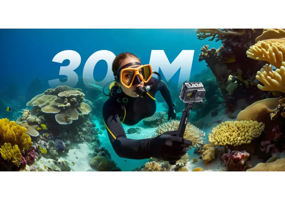 מארז עמיד למים – עמידות מלאה למים עד לעומק של 30 מטרים. המארז האטום מאפשר לכם לצלול ולתעד את עולם המים ללא חשש, תוך הגנה מקסימלית על המצלמה מפני חול, אבק ומכות חיצוניות.