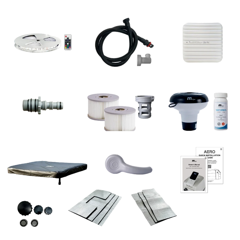 רצועת תאורת LED, צינור ניפוח עם מתאם, כרית מתנפחת (Inflatable Bladder), מתאם לצינור גינה, בסיס מחסנית פילטר, מתקן להוספת כימיקלים, כיסוי ספא עם אבזם, פקקי אוויר ומים, מפתח ייעודי, שכבת בידוד תרמית (מרובעת), מזרן תרמי לקרקע (מרובע), מדריך למשתמש