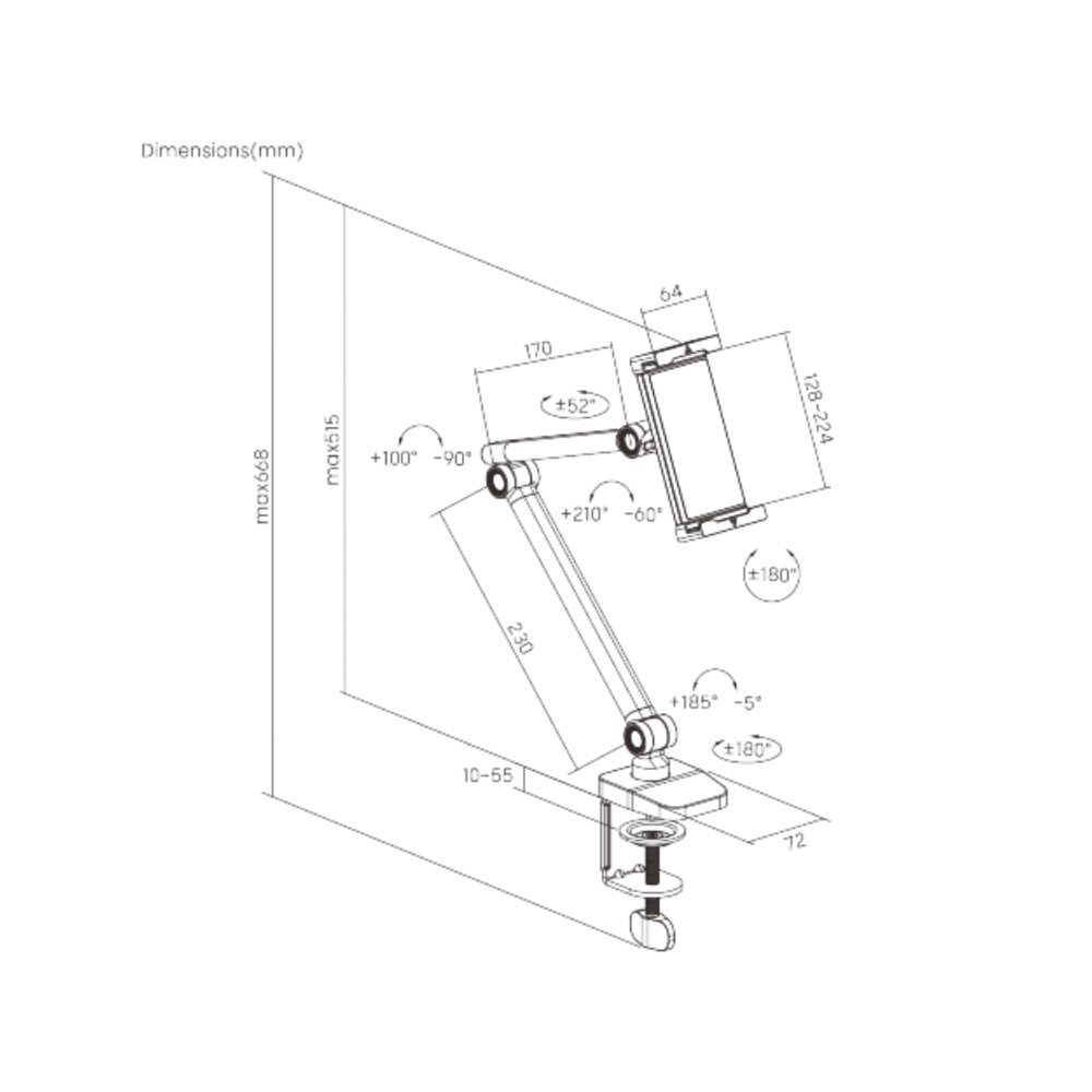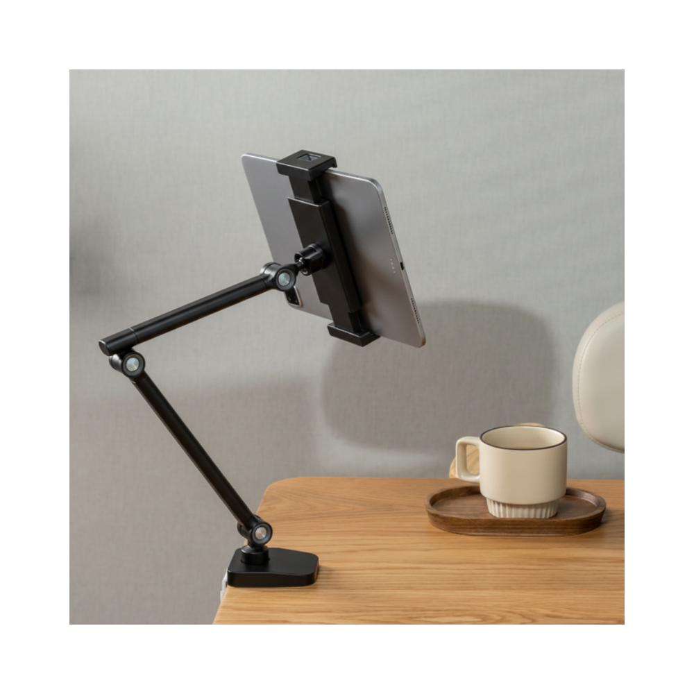 מעמד שולחני לטלפון/טאבלט לשימוש יומיומי בעבודה, ובשעות הפנאי. כולל זרוע מתכווננת עם מפרקים גמישים להתאמה מדויקת של גובה וזווית. בסיס קומפקטי חוסך מקום על שולחן העבודה, ותפסן שולחני מתאים למשטחים בעובי 10–55 מ״מ ומבטיח אחיזה יציבה ללא רעידות. ראש ההתקנה מסתובב ב־360°, ותושבת המצוידת ברפידות הגנה למניעת שריטות ולשמירה על המכשיר.