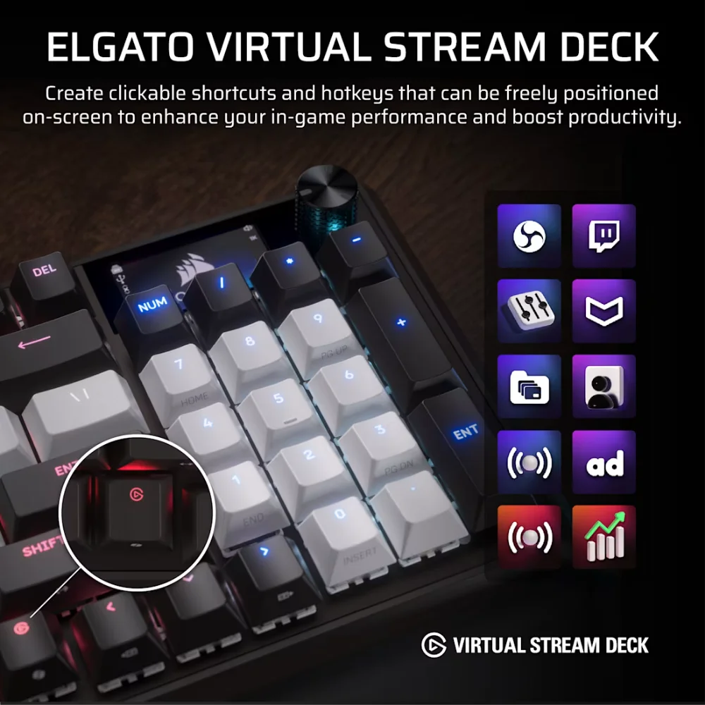 שמרו על יעילות מקסימלית בעזרת ששת מקשי ה-G הייעודיים המאפשרים אינטגרציה מלאה עם תוכנת Elgato Stream Deck להפעלת פקודות ושידורים בלחיצת כפתור. גוף המקלדת בנוי עם לוח עליון מאלומיניום איכותי המעניק עמידות יוצאת דופן לאורך זמן, בעוד שמקשי ה-PBT Double-shot מבטיחים שהמרקם והאותיות יישארו כחדשים גם לאחר שנים של שימוש אינטנסיבי.