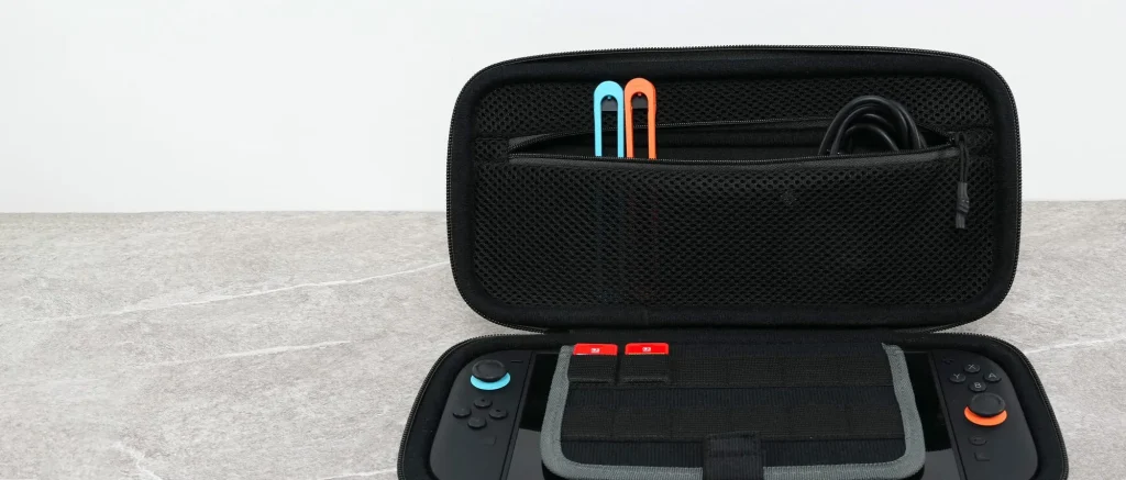 כיס רשת עם רוכסן מאפשר אחסון בטוח של אביזרים קטנים ל-Nintendo, ותאי אחסון לכרטיסי משחק