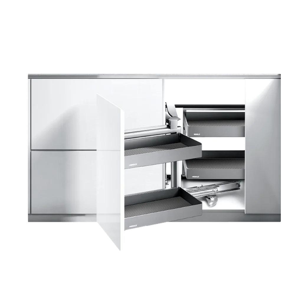 מערכת Shearer Magic Corner מבית HIGOLD נועדה למקסם את שטח האחסון בארון הפינתי ולאפשר גישה נוחה, ברורה ומסודרת לכל תכולת הארון. באמצעות מנגנון שליפה חכם, המדפים יוצאים החוצה באופן מלא ומאפשרים שימוש יעיל גם בפינות העמוקות ביותר.
