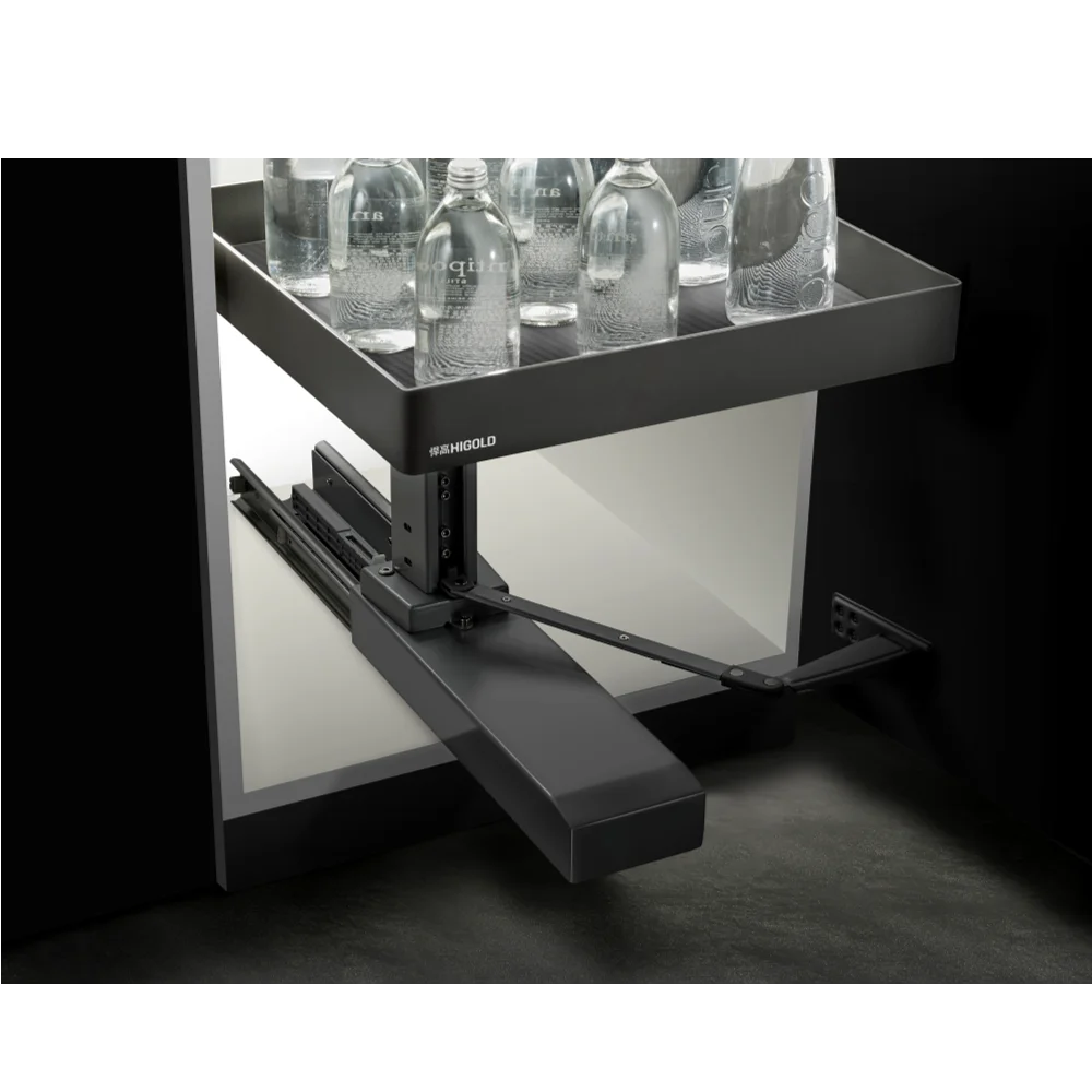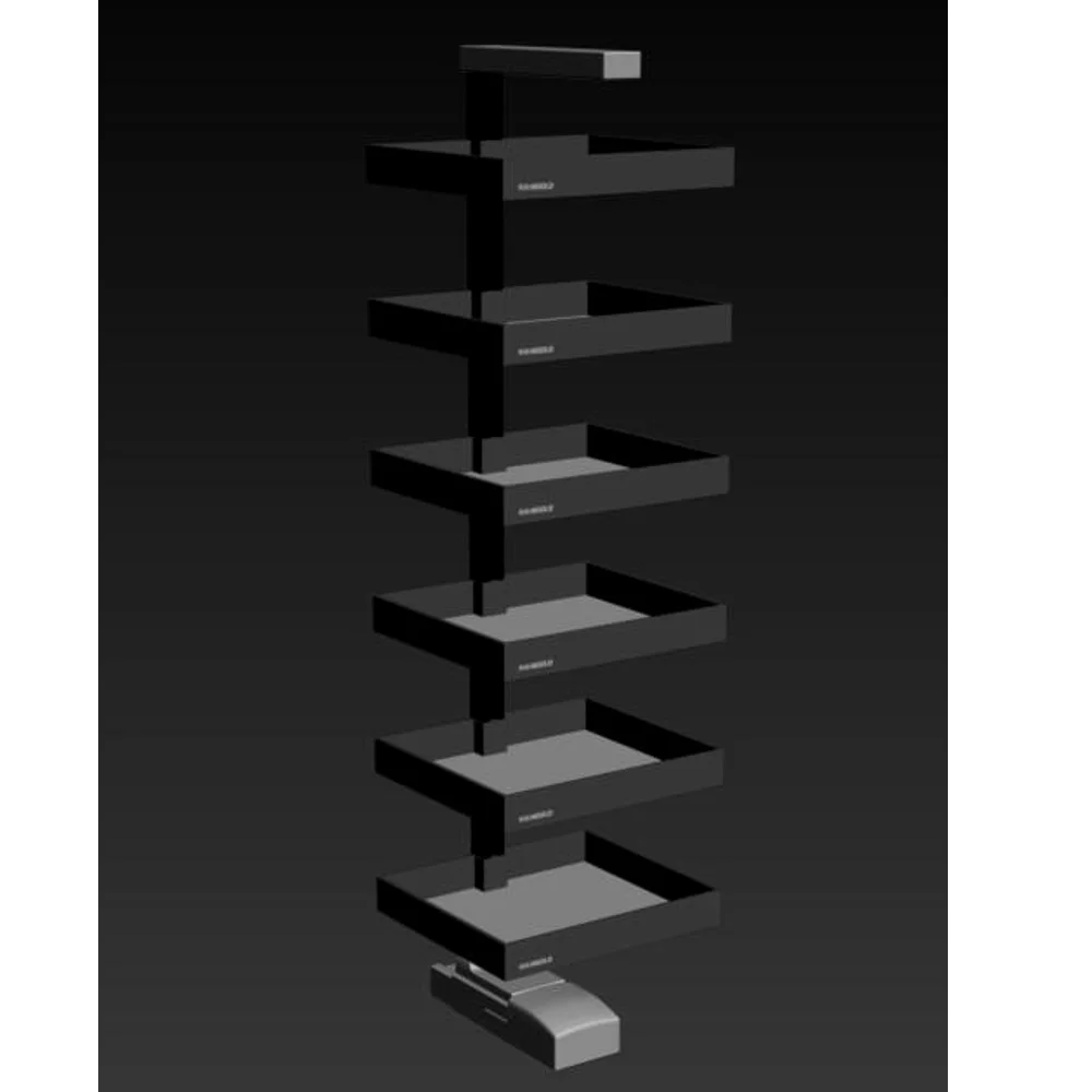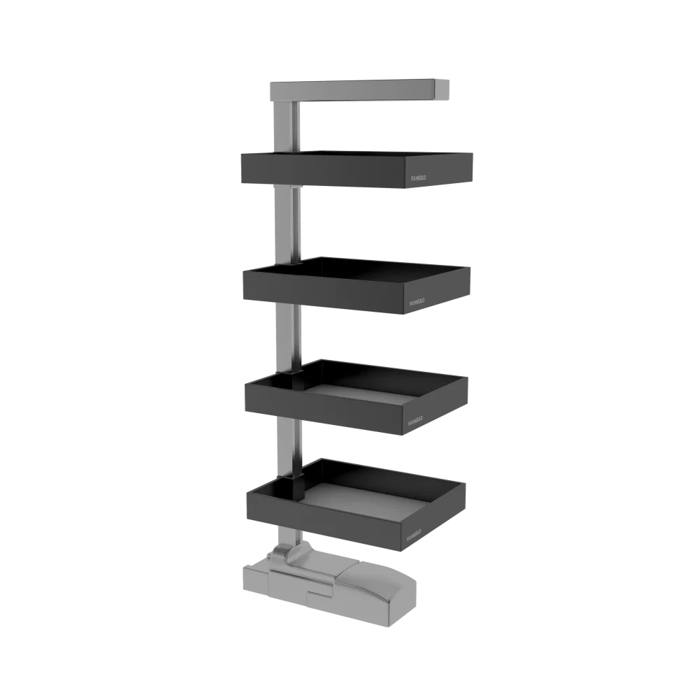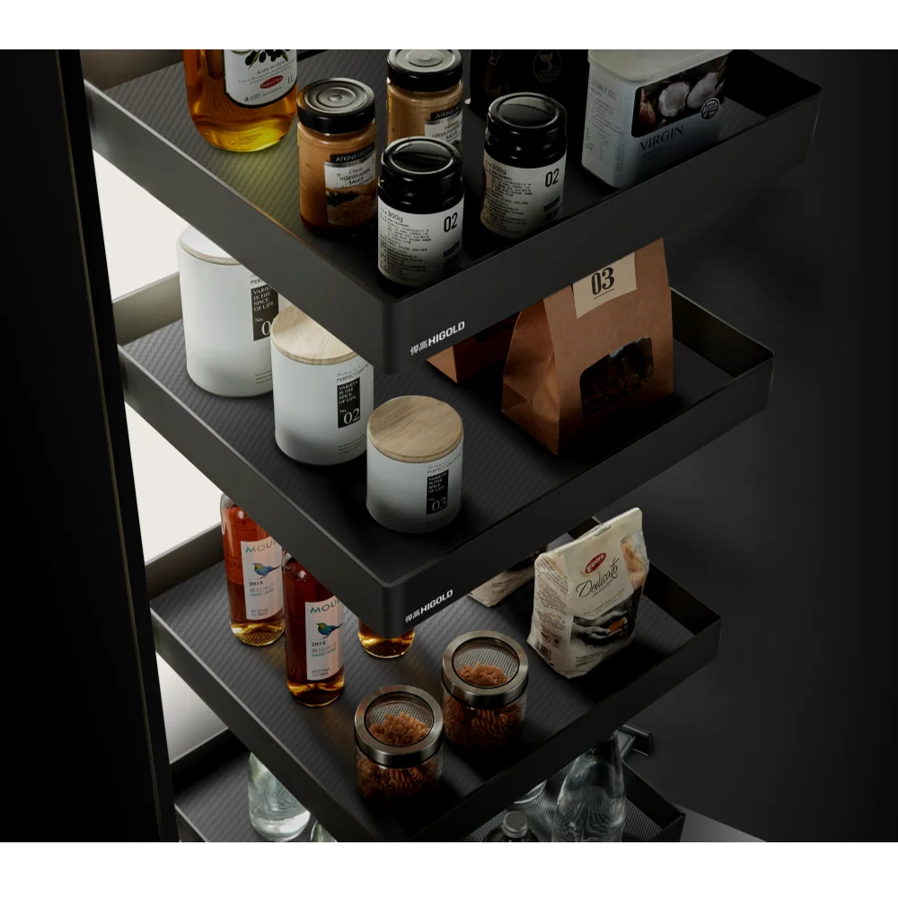 - היחידה מצוידת במנגנון פתיחה וסגירה המחובר ישירות לדלת הארון, מה שמאפשר גישה נוחה וחלקה לכל המגשים. בנוסף, המסילות השקטות והכבדות מבטיחות פעולה חלקה ויציבה, גם כאשר המגשים עמוסים, ומעניקות חוויית שימוש איכותית ונוחה לאורך זמן. המזווה משלב עיצוב יוקרתי עם פונקציונליות מקסימלית, מה שהופך אותו לאביזר חיוני בכל מטבח מודרני