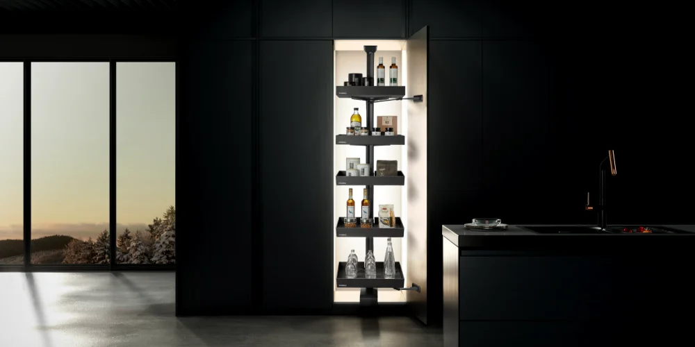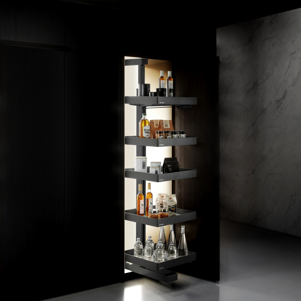 מזווה Pantry Space מספק פתרון אחסון איכותי ומאורגן למטבח, עם מספר מגשים רב‑שכבתי מתכווננים. כל מגש ניתן להתאמה אישית, כך שניתן לאחסן פריטים בגדלים שונים בצורה נוחה ומסודרת. היחידה כוללת מנגנון פתיחה וסגירה המחובר ישירות לדלת הארון, המאפשר גישה קלה וחלקה לכל המגשים.