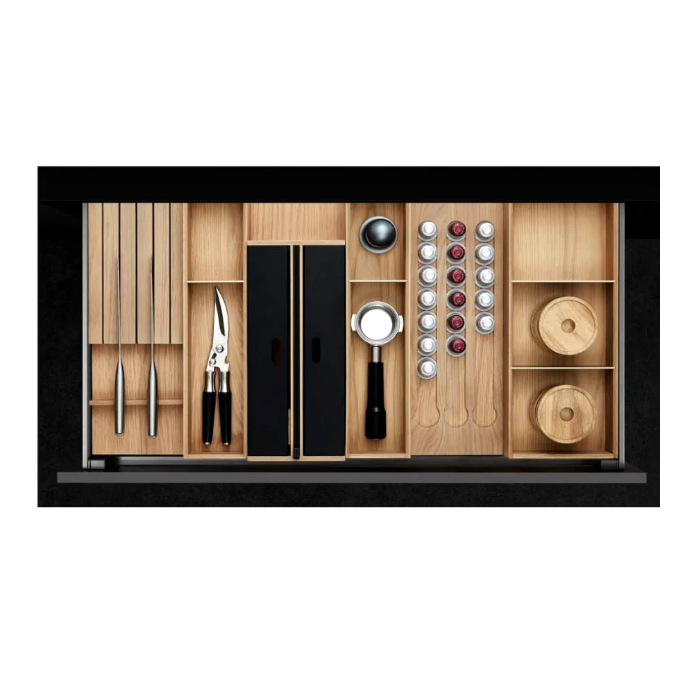 קופסת האחסון והמחיצה למגירות המטבח נועדה ליצירת סדר חכם, נגיש ואסתטי, תוך ניצול מיטבי של שטח המגירה ושמירה על ארגון מוקפד של כלי המטבח והאביזרים.