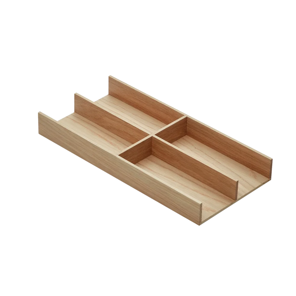מחיצה מחולקת 200 מ"מ בצורת U עשויה מעץ אלון לבן, מיועדת לארגון חלל פנימי במגירות ומאפשרת יצירת תאים נפרדים לשמירה על סדר ונגישות בכל פתיחה.