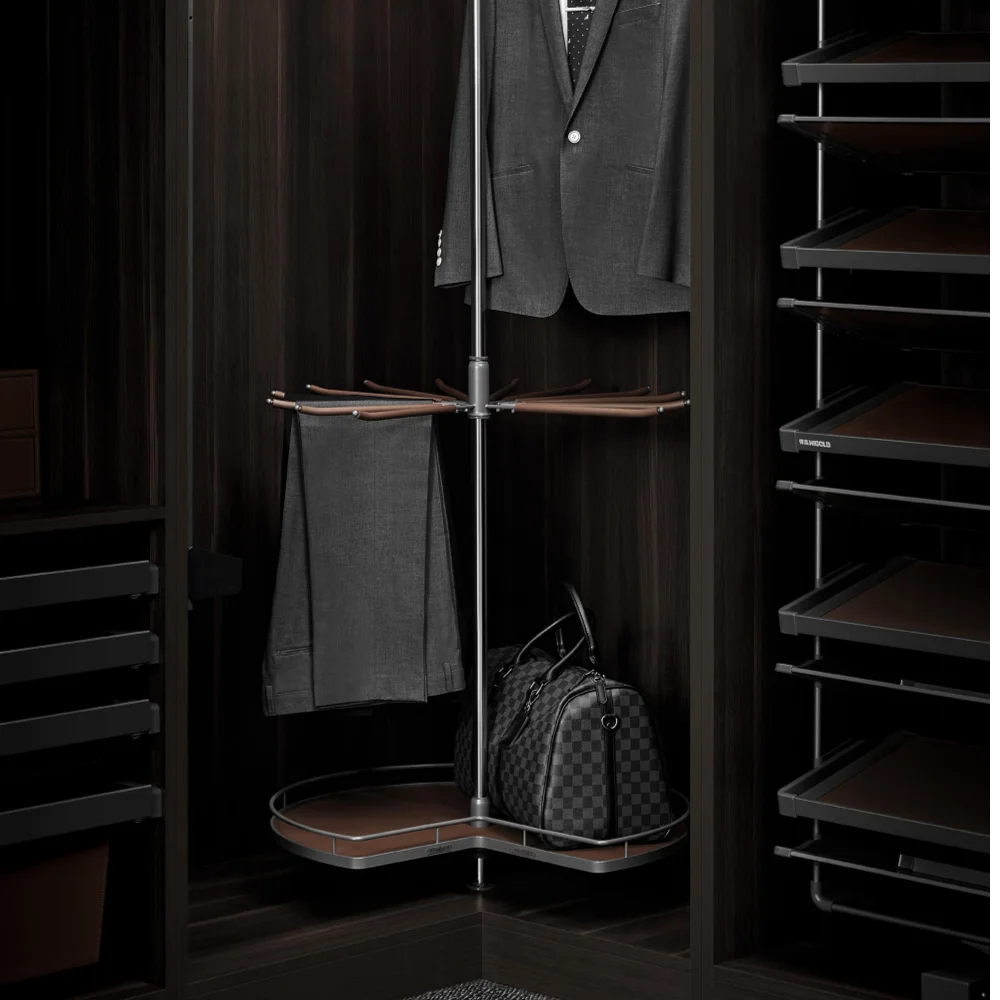 מערכת האחסון המסתובבת 360° מבית HIGOLD מציעה פתרון חכם ויוקרתי לאחת הבעיות המוכרות ביותר בארונות בגדים, ניצול פינות הארון.