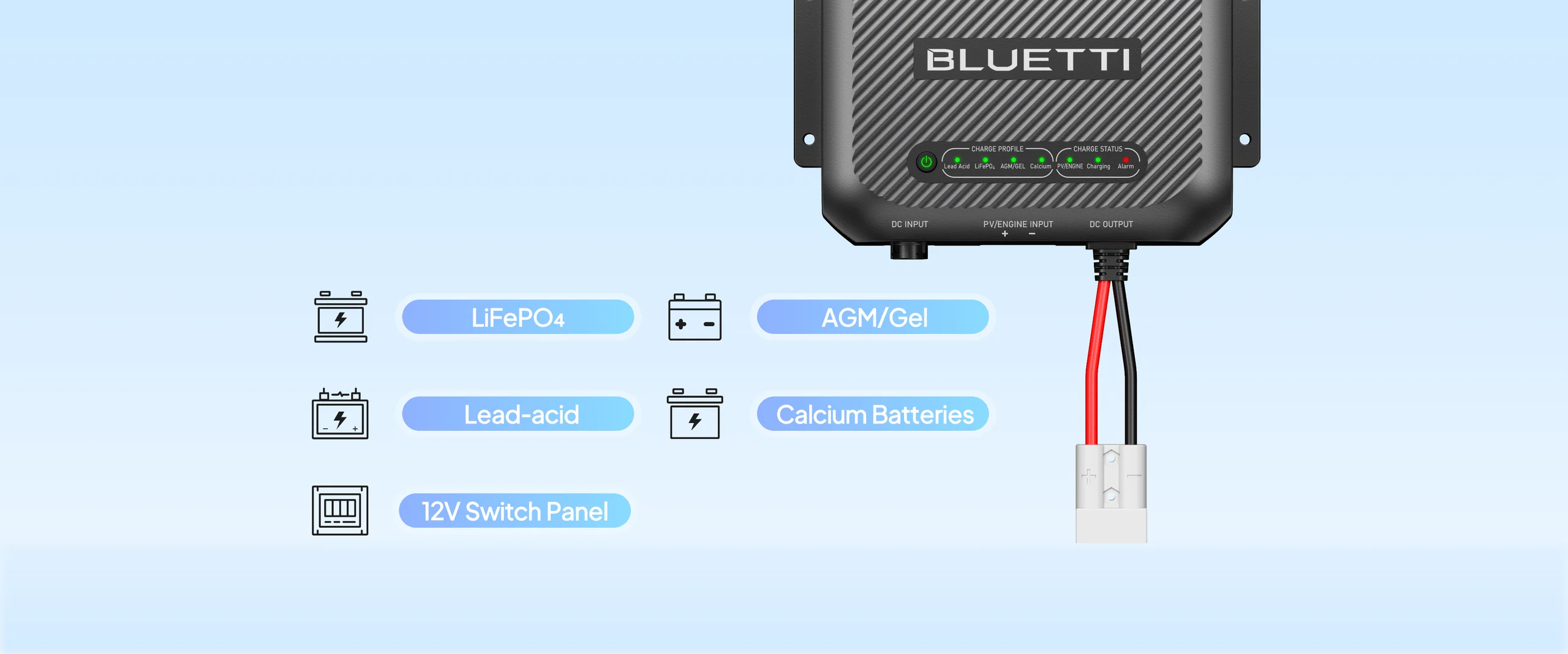 • תואם עם: סוללות LiFePO₄, AGM / ג'ל, עופרת-חומצה וסוללות סידן