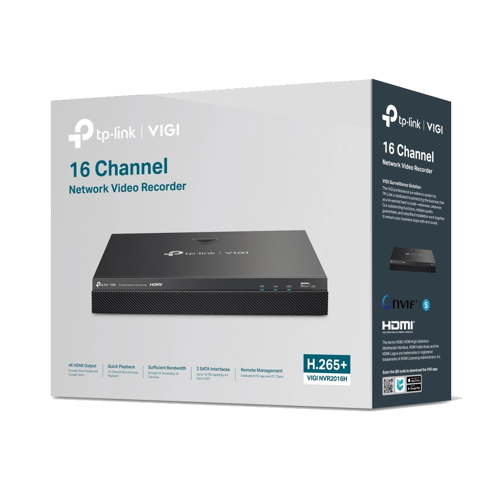 ה־VIGI NVR2016H הוא מקליט רשת מקצועי מבית TP-Link עם 16 ערוצים, דחיסת +H.265, פלט HDMI 4K עצמאי, ותמיכה באחסון של עד ‎32TB‎ (‎2×16TB‎). מתאים במיוחד למערכות אבטחה בינוניות עד גדולות, עם ניתוח אירועים חכם, שליטה מרחוק, ותמיכה מלאה ב־ONVIF Profile S.