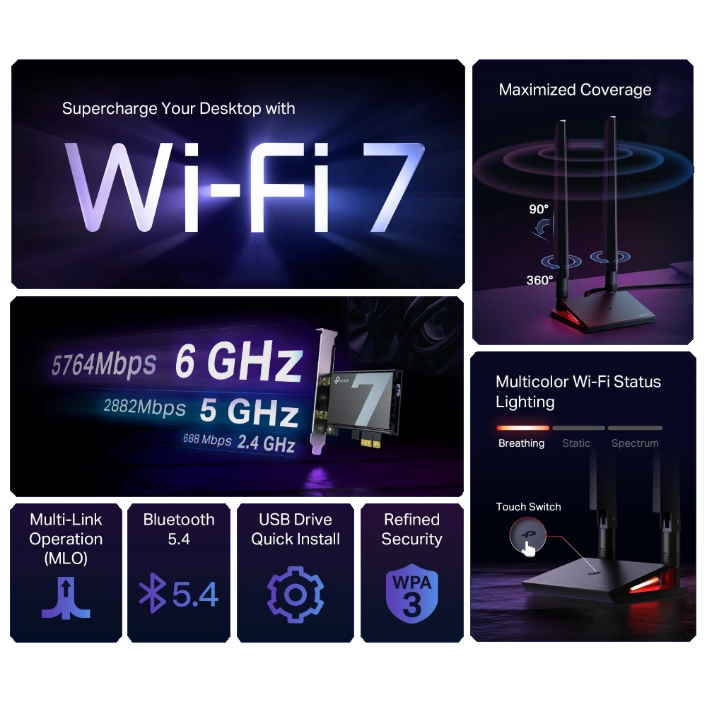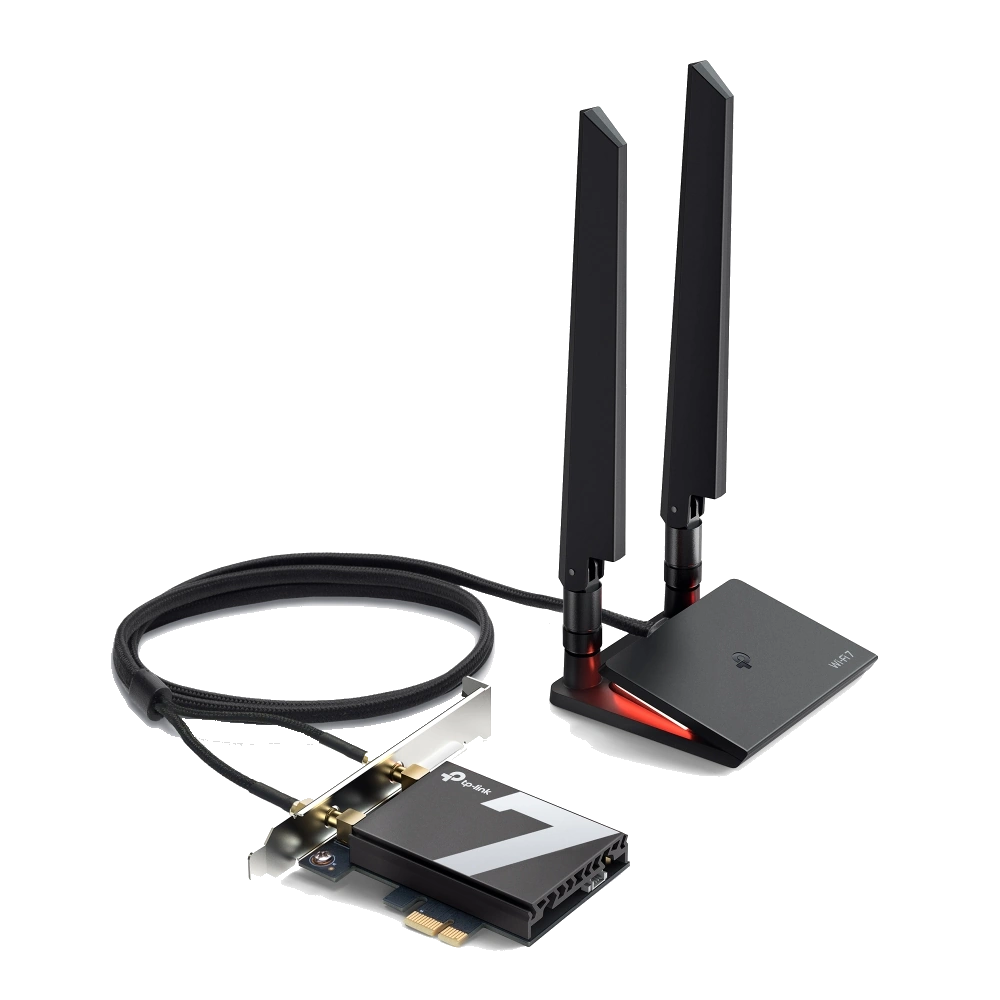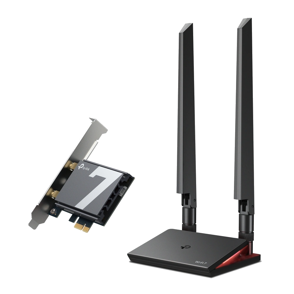 Archer TBE550E הוא מתאם PCI Express מתקדם בתקן Wi-Fi 7 (802.11be) עם חיבור Tri-Band לתדרי ‎2.4GHz‎, ‎5GHz‎ ו-‎6GHz‎, המספק ביצועים קיצוניים, השהיה נמוכה ואמינות גבוהה במיוחד. המתאם תומך בטכנולוגיית Multi-Link Operation (MLO) לשימוש סימולטני במספר תדרים, כולל Bluetooth 5.4, אנטנות חיצוניות עם בסיס מגנטי ותאימות ייעודית ל-Windows 11 (64bit).